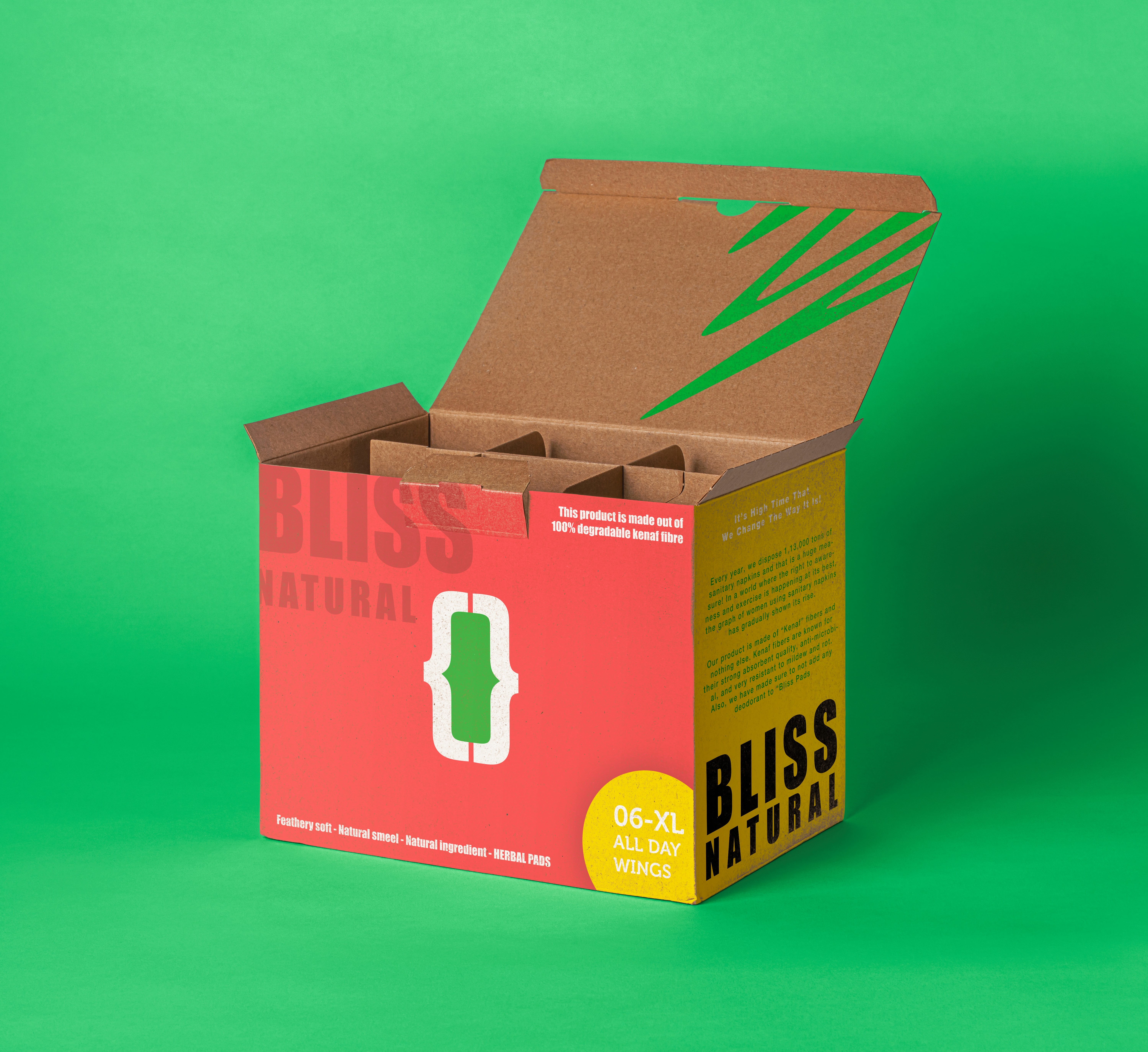 Bliss Natural pads is a fast-growing and eco-friendly sanitary napkin made from kenaf fibres (Kenaf stem waste), which is a well-known substitute for jute. Niveda R and Gowtham S created bliss Natural, in Coimbatore, and they claim their product to be sustainable. Being 100% bio-degradable, the Indian bureau of standards has accredited the product as bio-based and meeting the United Nations' sustainable standards.